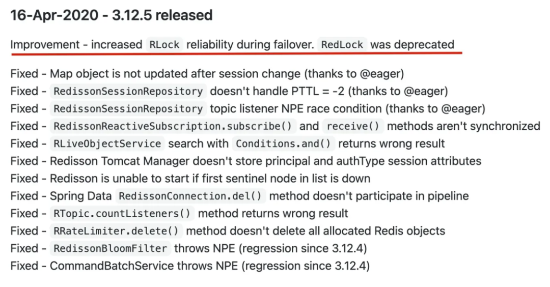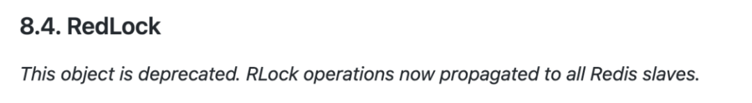因为 RedLock 存在的问题争议较大,且没有完美的解决方案,所以 Redisson 中已经废弃了 RedLock,这一点在 Redisson 官方文档中能找到,如下图所示:
