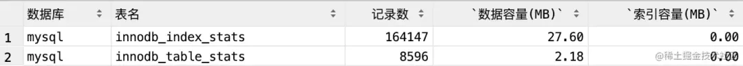 复制select table_schema as 数据库, table_name as 表名, table_rows as 记录数, truncate(data_length/1024/1024, 2) as 数据容量(MB), truncate(index_length/1024/1024, 2) as 索引容量(MB) from information_schema.tables where table_schema=mysql order by data_length desc, index_length desc;1.2.3.4.5.6.7.8.9.查询出的结果如下: