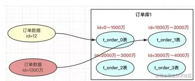 2.range 范围方案以范围进行拆分数据,就是在某个范围内的订单,存放到某个表中。比如id=12存放到user1表,id=1300万的存放到user2 表。