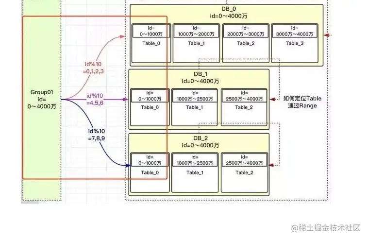 3.hash取模和range方案结合如下图 我们可以看到 group 组存放id 为0~4000万的数据,然后有三个数据库 DB0 DB1 DB2,DB0里面有四个数据库,DB1 和DB2 有三个数据库。