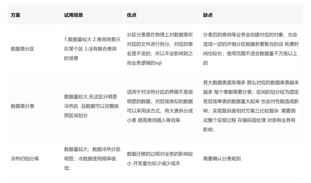 这里提供了三种解决方案,包括数据表分区,分库分表,冷热数据归档 了解完这些方案之后大家可以选取适合自己业务的方案。