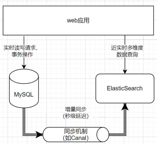 MySQL继续承担业务的实时读写请求、事务操作,ES承担近实时的多维度查询请求,ES可支撑十万级别qps(取决于节点数、分片数、副本数)。