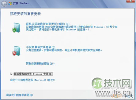 (5) 获取安装的重要更新。安装程序会提示获取安装的重要更新,联网用户可以选择第一项“联机以获取最新安装更新”,这是系统推荐的。没联网用户可选择第二项“不获取最新安装更新”,如图(2)所示: