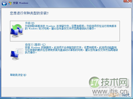 (6) 选择安装类型。有两种安装类型:“升级”和“自定义(高级)”。即从 XP升到Win选择“升级安装”,推荐选择“自定义方式”全新安装Windows 7,这样才可和Windows XP组成双系统,系统会自动生成启动菜单,如图(3)所示: