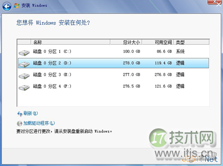 (7) 选择安装位置。因为C盘为XP系统盘,所以选择D盘安装Windows 7,点击下一步,如图(4)所示: