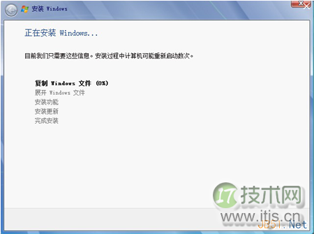 (9) 重启计算机后继续安装。安装程序复制一些文件后,系统自动重启,将进入Windows 7安装继续复制文件和展开文件,待完成后,系统自动再次重启。