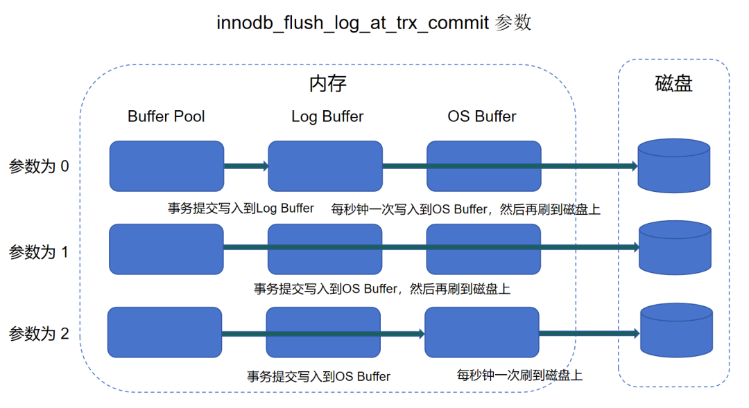 等于2:事务提交时将仅将 Redo Log 写入到 OS Buffer 中,然后操作系统每秒钟进行一次 Redo Log 的刷盘操作。