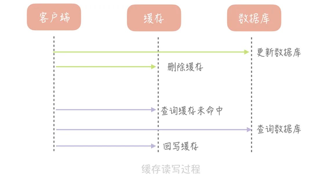那我们要如何解决这个问题呢?其实,我们可以在更新数据时不更新缓存,而是删除缓存中的数据,在读取数据时,发现缓存中没了数据之后,再从数据库中读取数据,更新到缓存中。