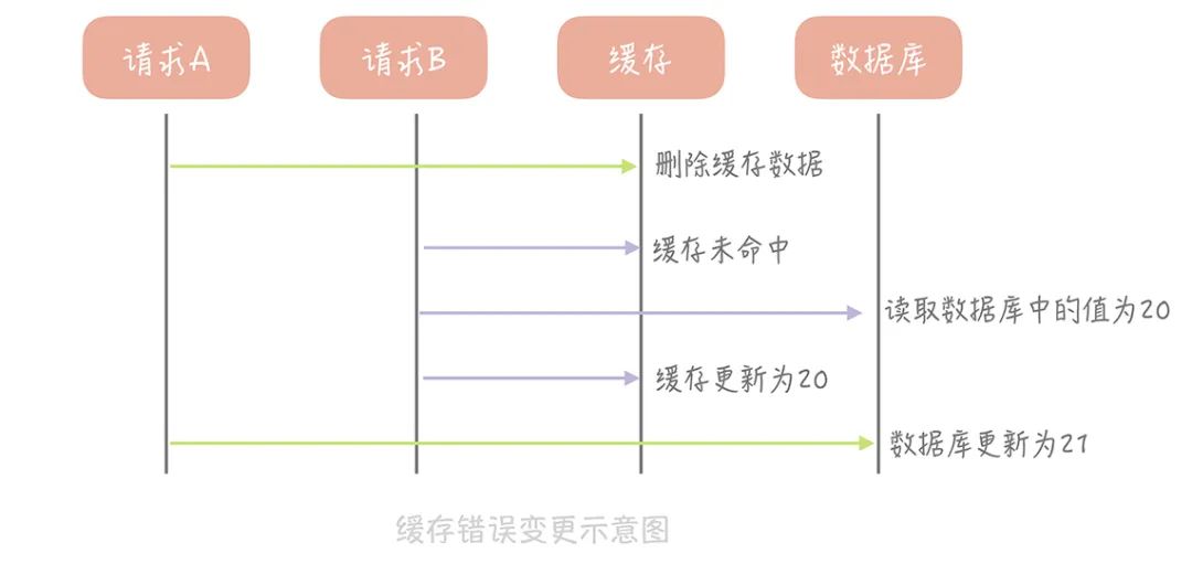 假设某个用户的年龄是 20,请求 A 要更新用户年龄为 21,所以它会删除缓存中的内容。这时,另一个请求 B 要读取这个用户的年龄,它查询缓存发现未命中后,会从数据库中读取到年龄为 20,并且写入到缓存中,然后请求 A 继续更改数据库,将用户的年龄更新为 21,这就造成了缓存和数据库的不一致。