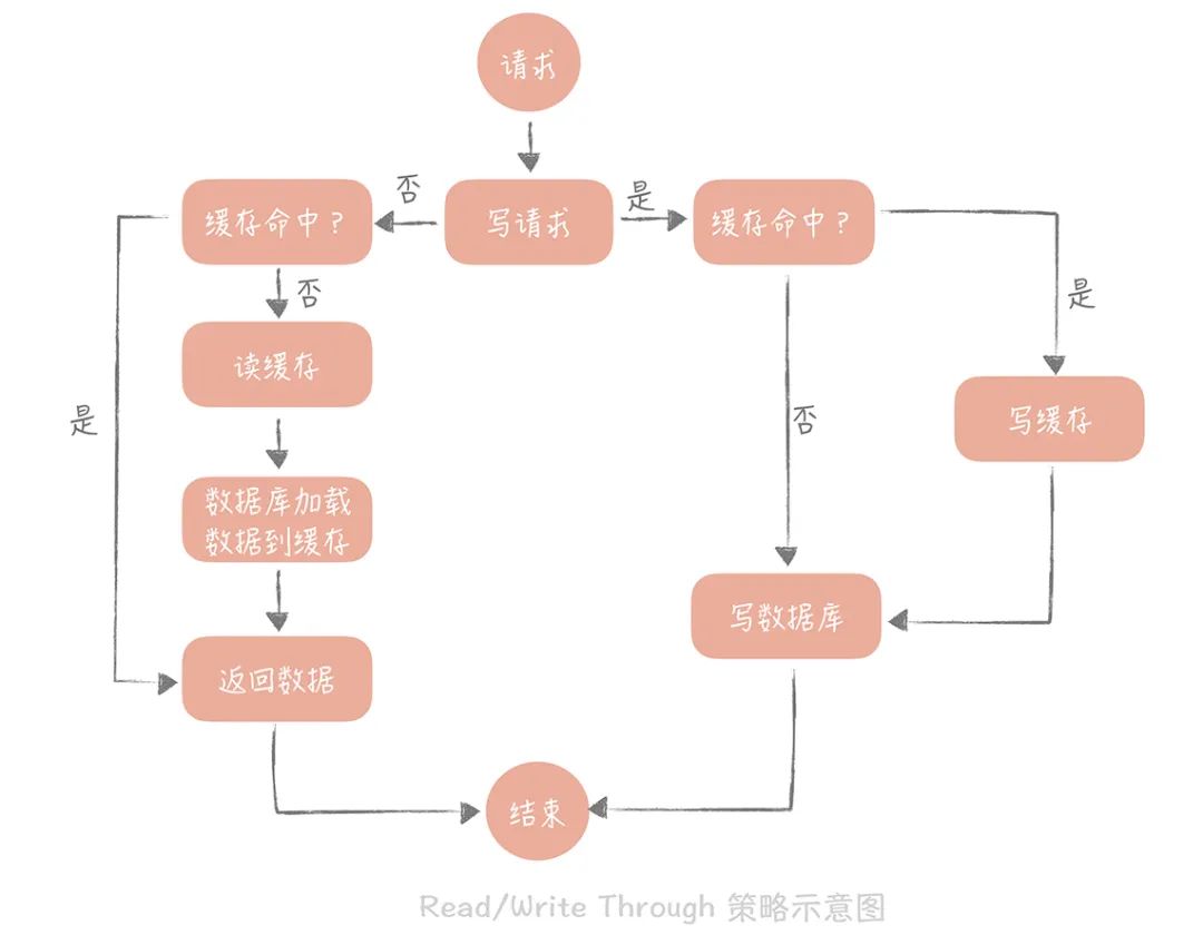 Read Through/Write Through 策略的特点是由缓存节点而非用户来和数据库打交道,在我们开发过程中相比 Cache Aside 策略要少见一些,原因是我们经常使用的分布式缓存组件,无论是 Memcached 还是 Redis 都不提供写入数据库,或者自动加载数据库中的数据的功能。而我们在使用本地缓存的时候可以考虑使用这种策略,比如说在上一节中提到的本地缓存 Guava Cache 中的 Loading Cache 就有 Read Through 策略的影子。