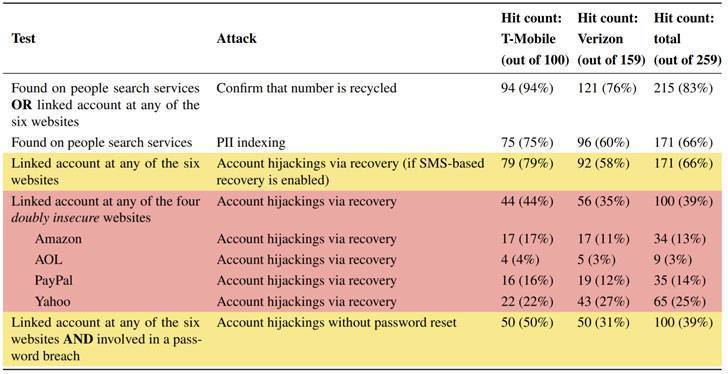 在抽样回收的小心调查中,有近66%被发现与流行网站上的被黑先前所有者的在线帐户相关联,黑客有可能通过简单地恢复与这些号码相关联的客利帐户来进行帐户劫持。