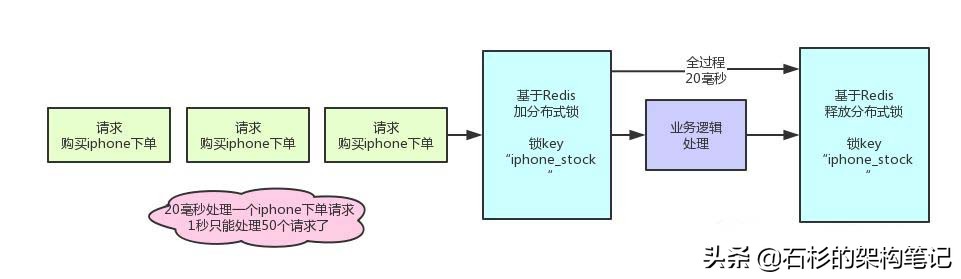 比如,对iphone这个商品的下单,都必对“iphone_stock”这个锁key来加锁。这样会导致对同一个商品的下单请求,就必须串行化,一个接一个的处理。