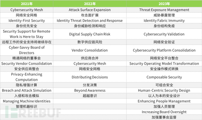 2023年3月份,Gartner在官网发布Top Cybersecurity Trends for 2023推文,我们用同样的方法把Gartner最近3年针对网络安全方面的趋势汇总归类下,详见表2: