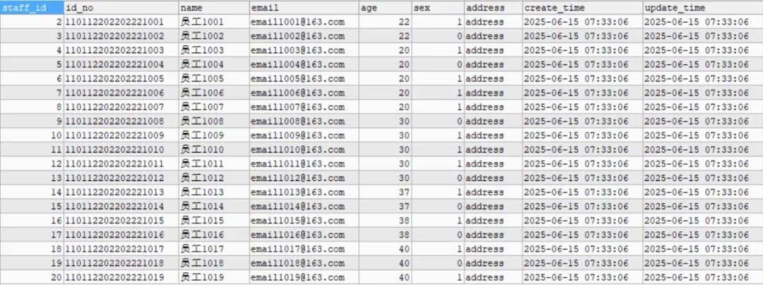复制CREATE TABLE`db_staff` ( `staff_id` i nt(8) NOTNULL AUTO_INCREMENT COMMENT员工编号,语原因 `id_no`varchar(20) DEFAULTNULLCOMMENT员工姓名, `name`varchar(20) DEFAULTNULLCOMMENT员工姓名, `email`varchar(200) DEFAULTNULLCOMMENT邮件地址, `age`tinyint(3) DEFAULTNULLCOMMENT年龄, `sex`tinyint(1) DEFAULT0COMMENT性别,0:男 1:女,发现 `address`varchar(300) DEFAULTNULLCOMMENT家庭住址, `create_time`timestampNOTNULLDEFAULTCURRENT_TIMESTAMPONUPDATECURRENT_TIMESTAMPCOMMENT创建时间, `update_time`timestampNOTNULLDEFAULTCURRENT_TIMESTAMPCOMMENT更新时间, PRIMARY KEY (`staff_id`), KEY`union_idno_name_email` (`id_no`,`name`,`email`) ) ENGINE=InnoDB AUTO_INCREMENT=1001DEFAULTCHARSET=utf81.2.3.4.5.6.7.8.9.10.11.12.13.然后往表中插入 20 条数据: