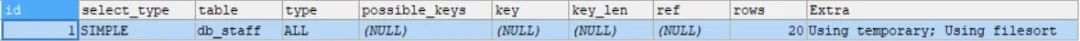 复制SELECT age,COUNT(age) ca FROM db_staff GROUP BY age ORDER BY NULL;1.修改后再看执行计划,Extra 字段中没有了 Using filesort。