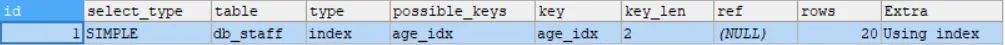 复制ALTER TABLE db_staff ADD KEY age_idx(age);1.修改后我们再看一下执行计划