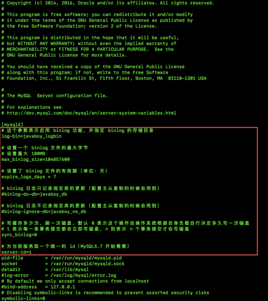 复制# 这个参数表示启用 binlog 功能,并指定 binlog 的存储目录log-bin=javaboy_logbin# 设置一个 binlog 文件的最大字节# 设置最大 100MBmax_binlog_size=104857600# 设置了 binlog 文件的有效期(单位:天)expire_logs_days = 7# binlog 日志只记录指定库的更新(配置主从复制的时候会用到)#binlog-do-db=javaboy_db# binlog 日志不记录指定库的更新(配置主从复制的时候会用到)#binlog-ignore-db=javaboy_no_db# 写缓存多少次,刷一次磁盘,默认 0 表示这个操作由操作系统根据自身负载自行决定多久写一次磁盘# 1 表示每一条事务提交都会立即写磁盘,n 则表示 n 个事务提交才会写磁盘sync_binlog=0# 为当前服务取一个唯一的 id(MySQL5.7 之后需要配置)server-id=11.2.3.4.5.6.7.8.9.10.11.12.13.14.15.16.17.18.19.20.21.22.23.24.25.26.27.28.各项配置的含义松哥已经在注视中说明了。截图如下: