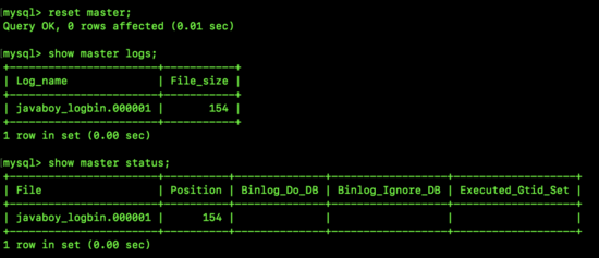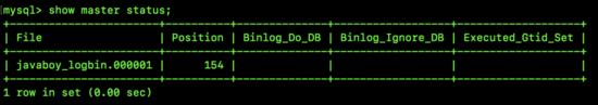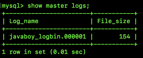 可以看到,我这里目前只有一个日志文件,文件名为 javaboy_logbin.000001,File_size 表示这个文件占用的字节大小是 154。
