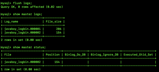 由上图可以看到,我们刷新日志之后,再通过 show master logs 去查看日志,发现日志文件已经多了一个新产生的了,然后再通过 show master status 去查看最新的日志文件信息,发现也已经变为 javaboy_logbin.000002。
