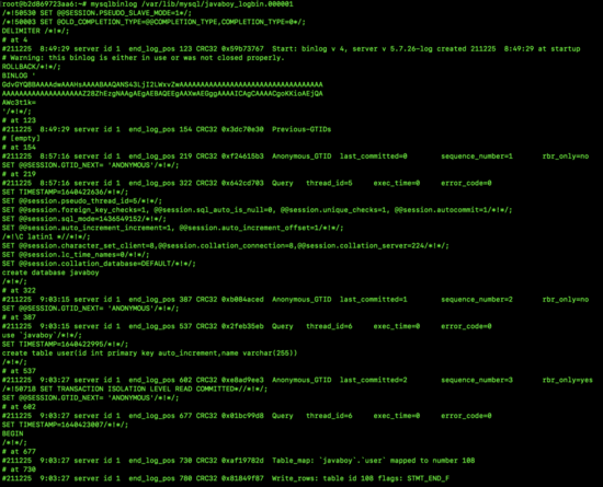 这个时候我们就要借助于 binlog 来恢复了。大家还记得,我们星期三凌晨三点执行备份的时候,用了一个参数叫做 --flush-logs,使用了该参数表示从备份那一刻起,新的 binlog 将产生在一个新的日志文件中,对于我们这里来说,新的 binlog 文件当然就是 javaboy_logbin.000002 了,我们去查看一下该文件:
