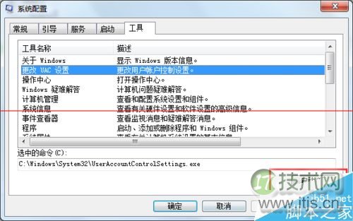 3、功能关闭A功在弹出的系统配置窗口中,点击鼠标切换到“工具”栏,接着选中列表中的“更改UAC设置”。