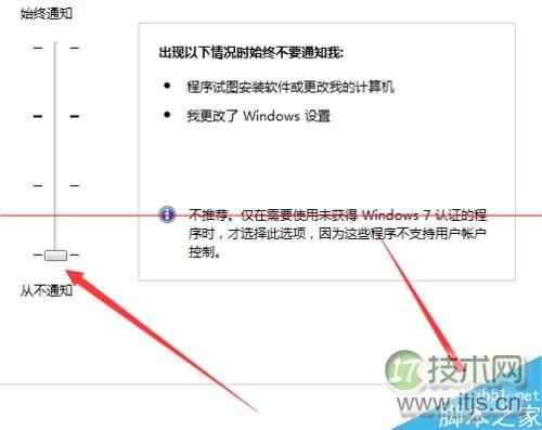 6、将拖动条拉到最下面,我们就可以关闭UAC功能。假如想详细了解,阅读右侧的说明即可。随后点击“确定”按钮保存修改。