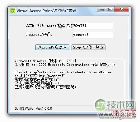 d.到此就完成设置,可以用其他设备找寻“PC-WIFI”这个热点,连接密码就是刚才软件中设置的“password”(这个密码可以改成您自己喜欢的IT技术网)