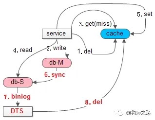 (6)主从同步;(7)通过工具订阅从库的binlog,这里能够最准确的知道,从库数据同步完成的时间;(8)从库执行完写操作,向缓存再次发起删除,淘汰这段时间内可能写入缓存的旧数据;如此这般,至少能够保证,引入缓存之后,主从不一致,不会比没有引入缓存更坏。