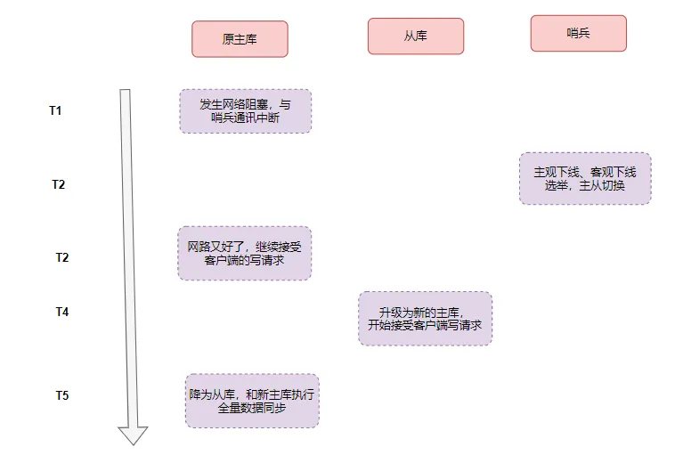 当旧的主库因为假死(假故障) 的原因,导致哨兵开始选举新的主库。在选举新主库期间,旧的主库莫名奇妙又好了,它可以继续接受写入的请求了。然后新主库选好了,就有两个主库在同时处理写请求啦。等到新主库选好之后,旧的主库就变成从库了,它需要从新的主库那里同步数据过来,这样一来,在切换期间,旧主库保存的数据就丢失啦。4. 我们该如何避免/应对脑裂的发生呢?