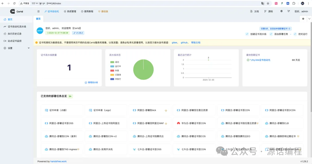 全自动申请与部署更新:支持证书申请过程的自动化,并能自动部署更新证书,确保证书永不过期。广泛的域名支持:支持阿里云、腾讯云、华为云、Cloudflare 等各种途径注册的域名。邮件通知:及时向用户发送相关通知,确保用户了解证书的状态。私有化部署:支持私有化部署,保障证书和授权信息等敏感数据的安全。免费服务:为用户提供免费的服务。整合域名证书:支持通配符域名/泛域名,支持多个域名打到一个证书上私有化部署宝塔面板方式部署1Panel 面板方式部署Docker 方式部署源码方式部署本文采用的是 Docker 的方式安装部署,过程相对简单,以下是详细的步骤: