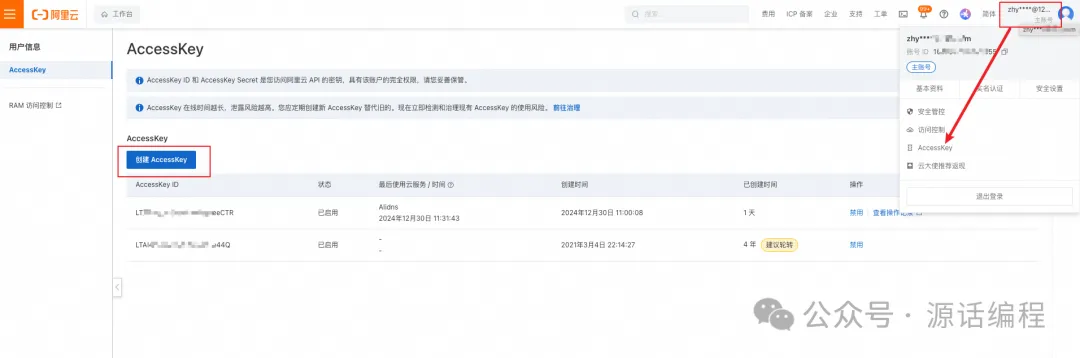 获取域名商的亿华云计算AccessKey,以阿里云为例,点击右上角账号信息,再点击AccessKey选项,创建AccessKey信息。