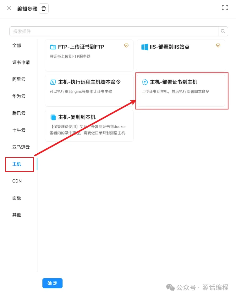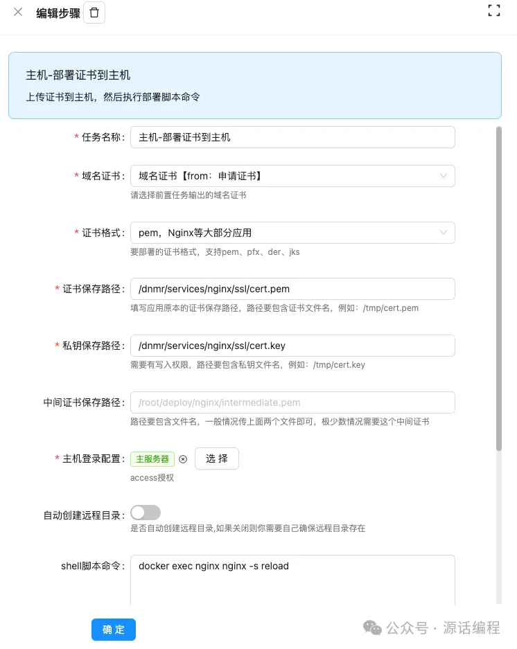 证书格式:选择 pem,Nginx等大部分应用证书保存路径:填写应用原本的证书保存路径,路径要包含证书文件名,例如:/tmp/cert.pem私钥保存路径:填写应用原本的证书保存路径,路径要包含证书文件名,例如:/tmp/cert.pem主机登录配置:添写服务器主机相关信息shell脚本命令:填写服务器主机要执行的命令运行策略:成功后跳过(非整数任务请选择它),证书没过期不需要重复部署