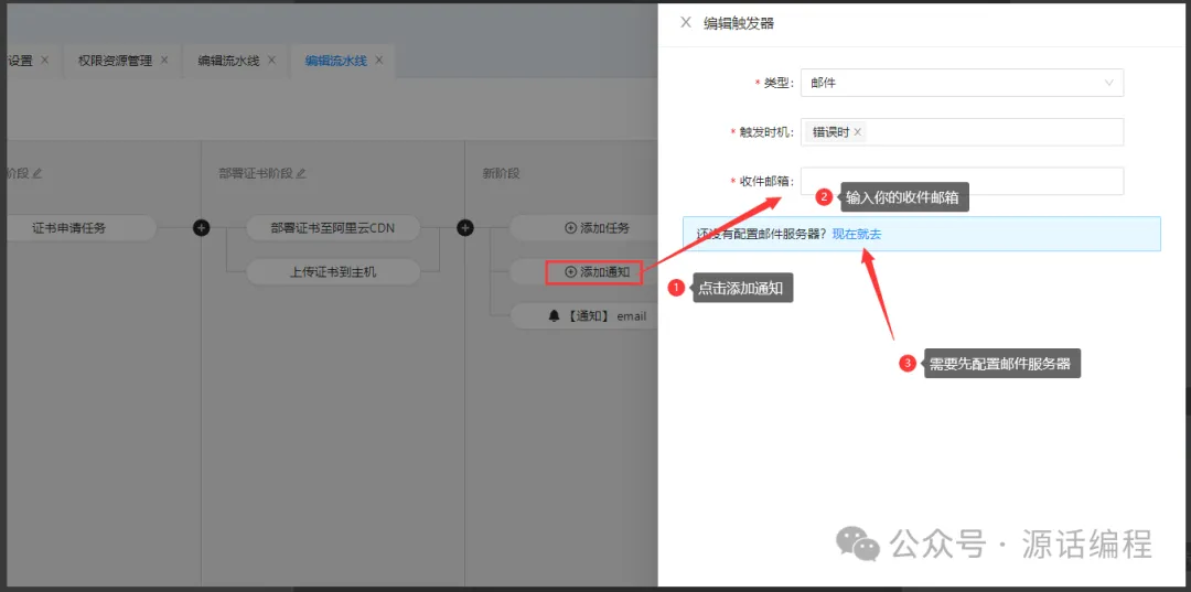 如需使用邮件通知可以配置添加通知,需要先配置邮件服务器