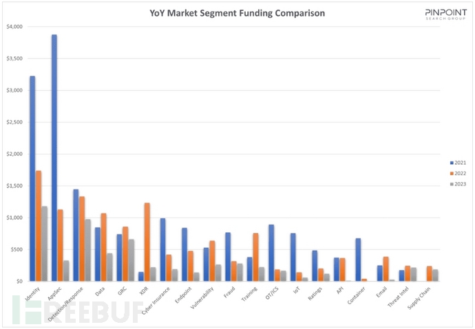 在所投资的细分领域中,身份识别、检测与响应以及治理、风险与合规(GRC)分列前三,但资金规模也都小于2022年和2021年。