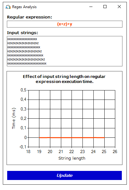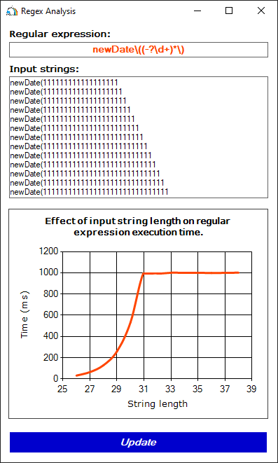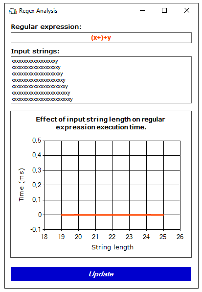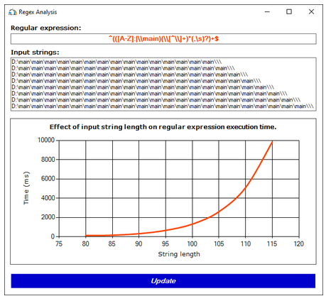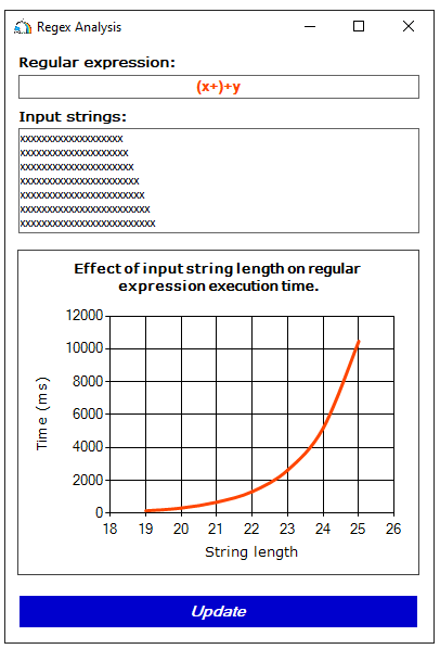 在这里编写了一个小程序,它显示了正则表达式的计算时间如何依赖于计算字符串中的字符数的图形。在接下来的示例中,将使用这个程序展示灾难性的回溯。