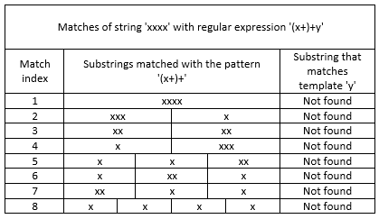 下表显示了xxxx字符串与(x+)+y正则表达式的几种可能匹配:
