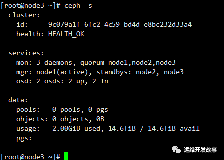 复制sudo -u ceph mkdir /var/lib/ceph/mgr/ceph-`hostname -s`cd /var/lib/ceph/mgr/ceph-`hostname -s`1.2. 创建身份验证密钥 复制ceph auth get-or-create mgr.`hostname -s` mon allow profile mgr osd allow * mds allow * > keyringchown ceph.ceph /var/lib/ceph/mgr/ceph-`hostnbame`/keyring1.2. 启动mgr守护进程 复制systemctl enable ceph-mgr@`hostname -s` && systemctl start ceph-mgr@`hostname -s`或者ceph-mgr -i `hostname`1.2.3.最后查看ceph运行状态,我只添加了两个osd。