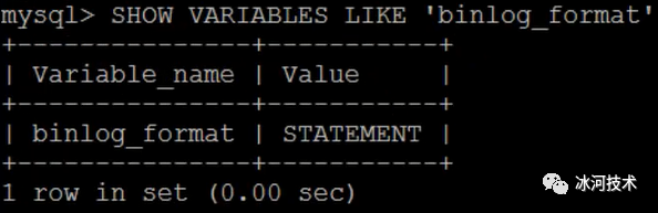 复制SHOW VARIABLES LIKE binlog_format;1.执行效果如下所示。