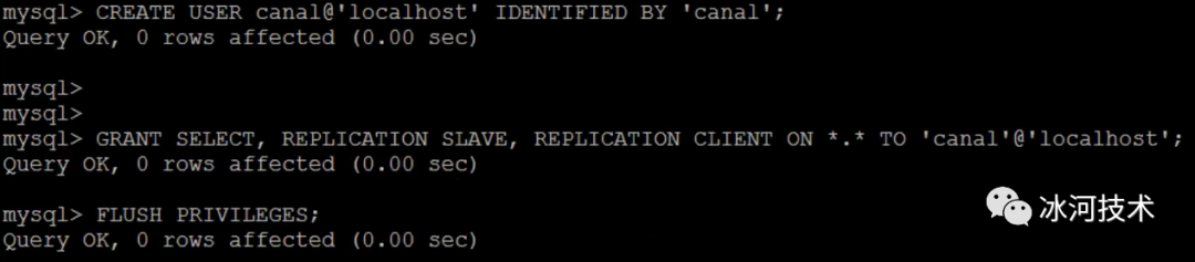 复制CREATE USER canal@localhost IDENTIFIED BY canal; GRANT SELECT, REPLICATION SLAVE, REPLICATION CLIENT ON *.* TO canal@localhost; FLUSH PRIVILEGES;1.2.3.