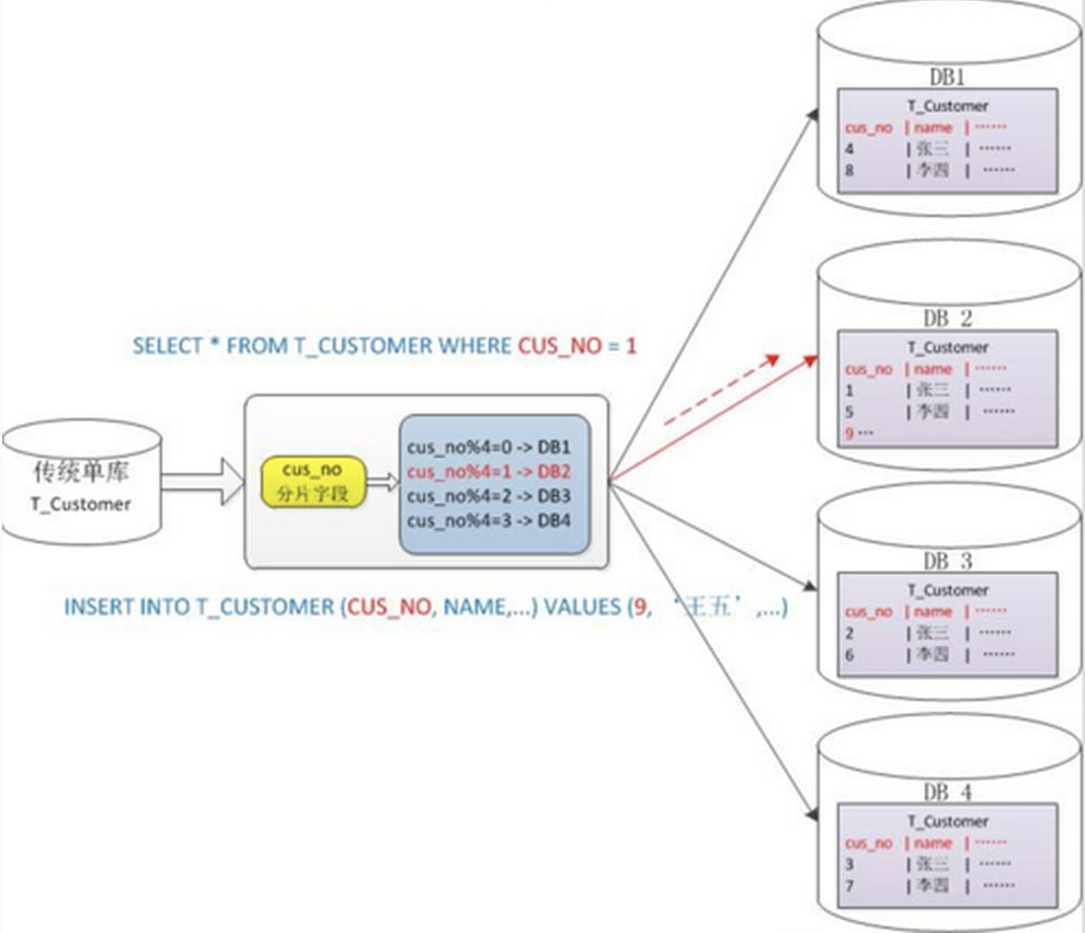 一般采用hash取模mod的切分方式,例如:将 Customer 表根据 cusno 字段切分到4个库中,余数为0的放到第一个库,余数为1的放到第二个库,以此类推。