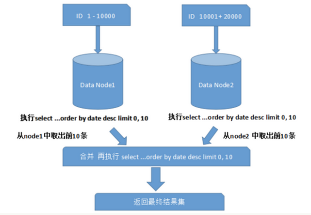 跨节点多库进行查询时,会出现limit分页、order by排序等问题。分页需要按照指定字段进行排序,当排序字段就是分片字段时,通过分片规则就比较容易定位到指定的分片;当排序字段非分片字段时,就变得比较复杂了,需要先在不同的分片节点中将数据进行排序并返回,然后将不同分片返回的结果集进行汇总和再次排序,最终返回给用户。如图所示: