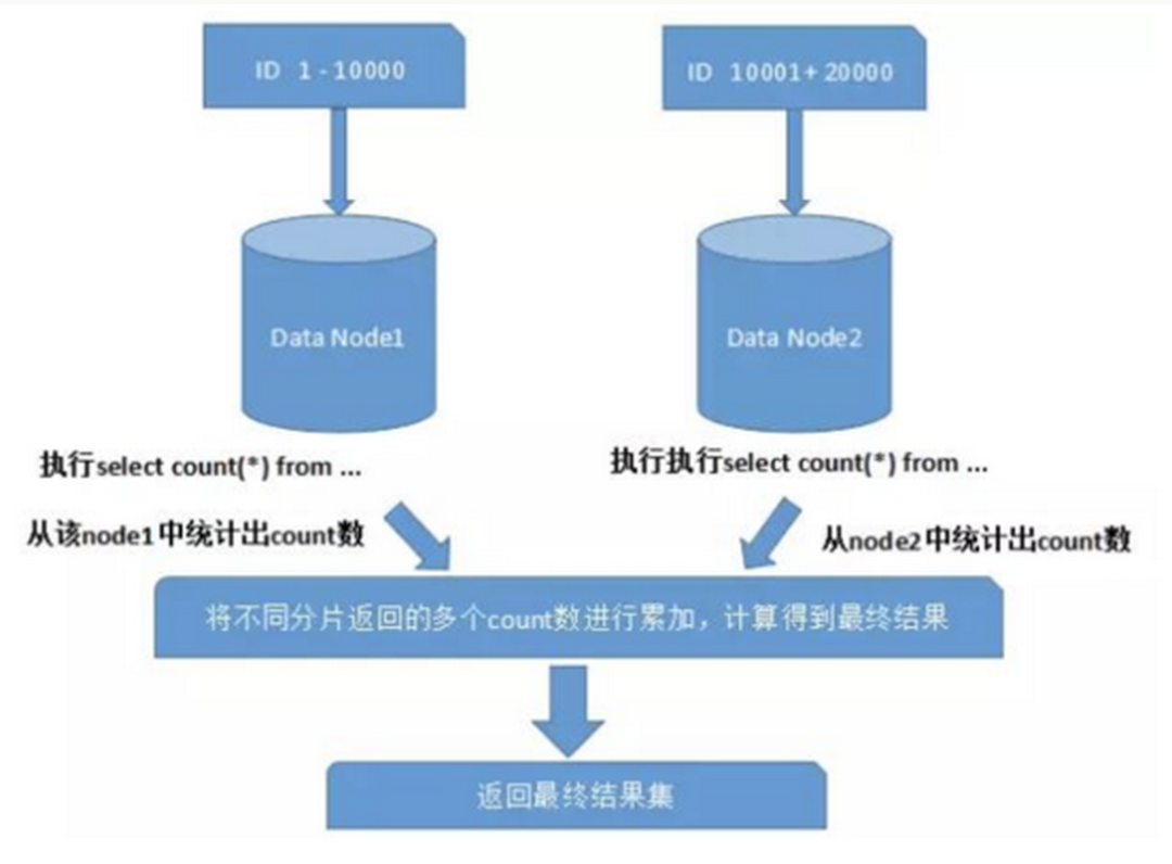 这样的操作是很耗费CPU和内存资源的,所以页数越大,系统的性能也会越差。在使用Max、Min、Sum、Count之类的函数进行计算的时候,也需要先在每个分片上执行相应的函数,然后将各个分片的结果集进行汇总和再次计算,最终将结果返回。如图所示: