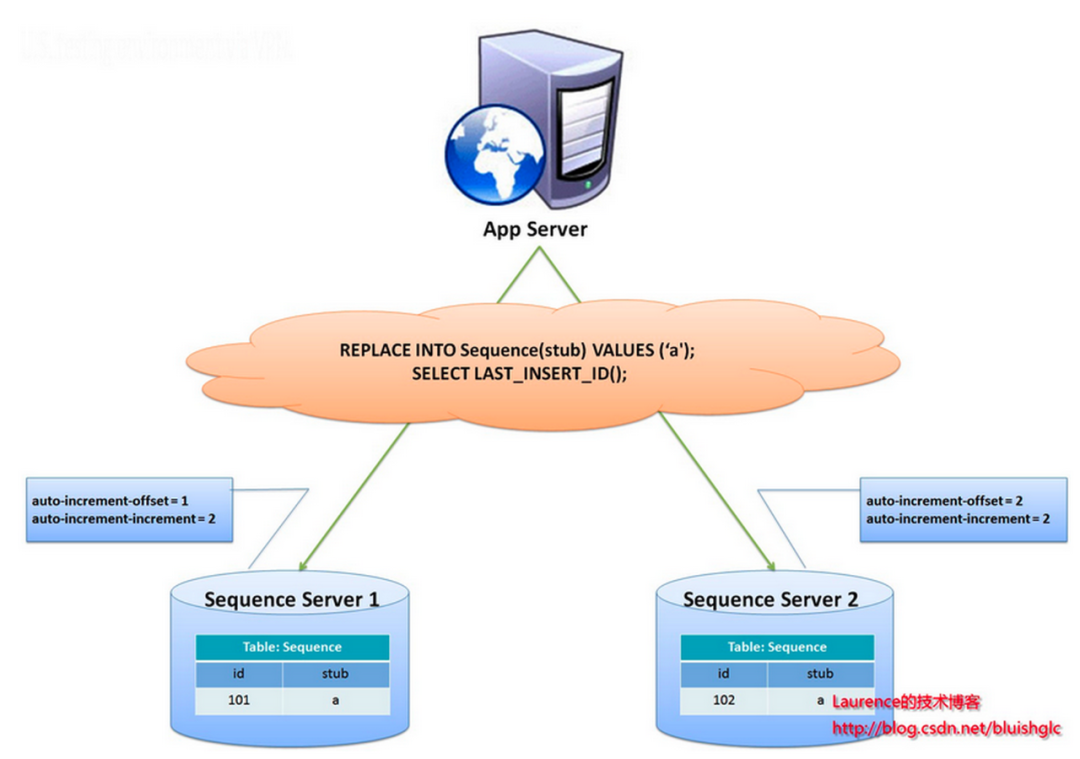 这一方案的整体思想是:建立2个以上的全局ID生成的服务器,每个服务器上只部署一个数据库,每个库有一张sequence表用于记录当前全局ID。表中ID增长的步长是库的数量,起始值依次错开,这样能将ID的生成散列到各个数据库上。如下图所示: