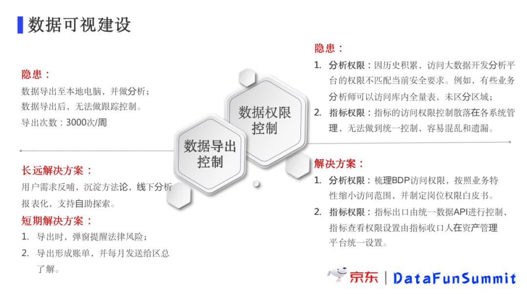 长远解决方案:用户需求反哺,沉淀方法论,线下分析报表化,支持自助探索。短期解决方案:导出时,弹窗提醒法律风险;导出形成账单,并每月发送给区总了解。在数据权限控制方面: