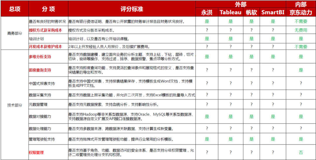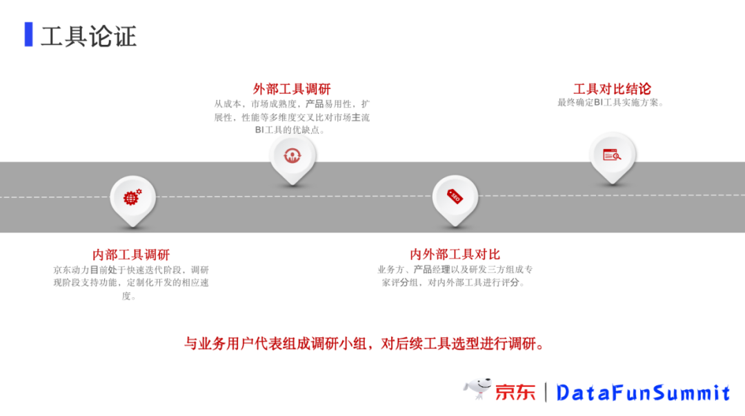 内部工具调研,京东动力目前处于快速迭代阶段,调研现阶段支持功能,定制化开发的相应速度;外部工具调研,从成本,市场成熟度,产品易用性,扩展性,性能等多维度交叉比对市场主流BI工具的优缺点;