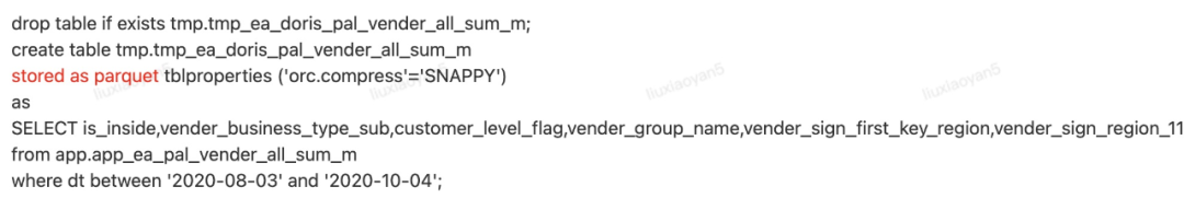 -d 表示对doris数据库的表进行操作【默认参数是:db_null 不执行建表】db_get_crt:表示打印出doris建表语句,该逻辑会读取hive中的表结构,然后将HIVE中的字段为string类型的当成维,int,bigint,double类型的当成值生成建表语句【具体逻辑请参考脚本】