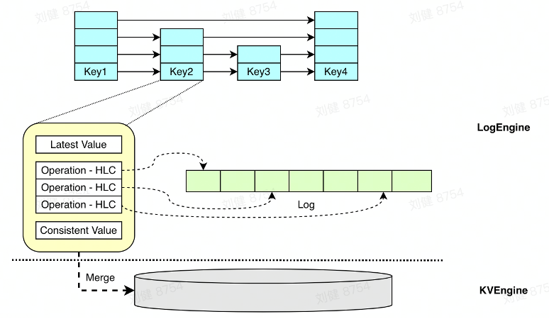 为了解决这个问题,我们引入了双引擎结构:多版本只存在 log engine 中。当完成冲突处理之后,单版本写入 KV engine,这样绝大部分的查询都是点查询,不再需要查看所有版本。log engine 中的索引是全内存的,这样多版本查询就不会影响性能。