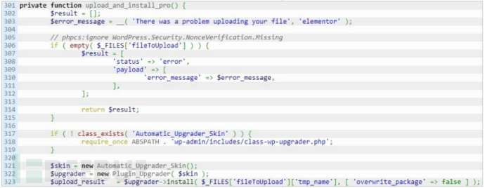另外,研究人员发现发现 RCE 漏洞可能涉及函数 upload_and_install_pro(),该函数将安装随请求发送的 WordPress 插件,这时, admin_init 允许以 WordPress 插件的形式上传文件, 威胁者可以将恶意文件放在里面以实现远程代码执行。