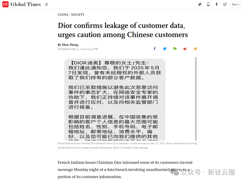 2025年5月12日,奢侈品巨头路威酩轩(LVMH)旗下核心品牌迪奥(Dior)在中国市场发生严重数据泄露事件,数据售企引发广泛关注。泄露