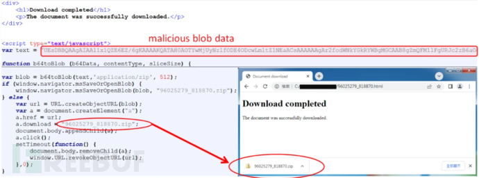 研究人员发现前两者使用了一种被称为“HTML 走私”的通过技术,该技术利用合法的传播 HTML5 和 JavaScript 功能对恶意数据进行编码。如下所示,等钓鱼受害者通过浏览器打开时会将数据块转换为 Dropper: